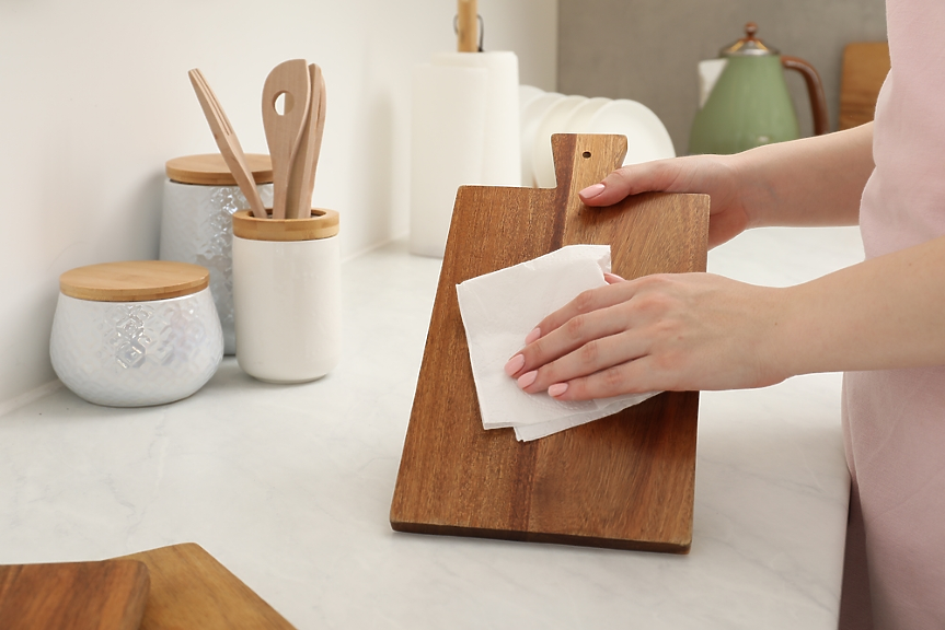 Ползвай отделна дъска за месо и отделна за плодове и зеленчуци. При дълбоки порезни следи или когато дъската започне да мирише постоянно, дори и след почистване – време е за нова!