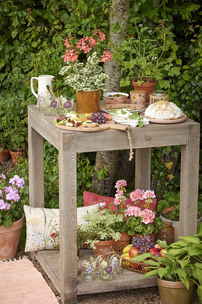 Цветята са задължителни за лятното градинско парти. Тази аранжировка за маса не изисква творчески талант, а само пъстри мушкати и саксии в пастелни цветове. Просто подредете саксиите с мушкати в центъра. Вашата ефектна лятна маса е готова!