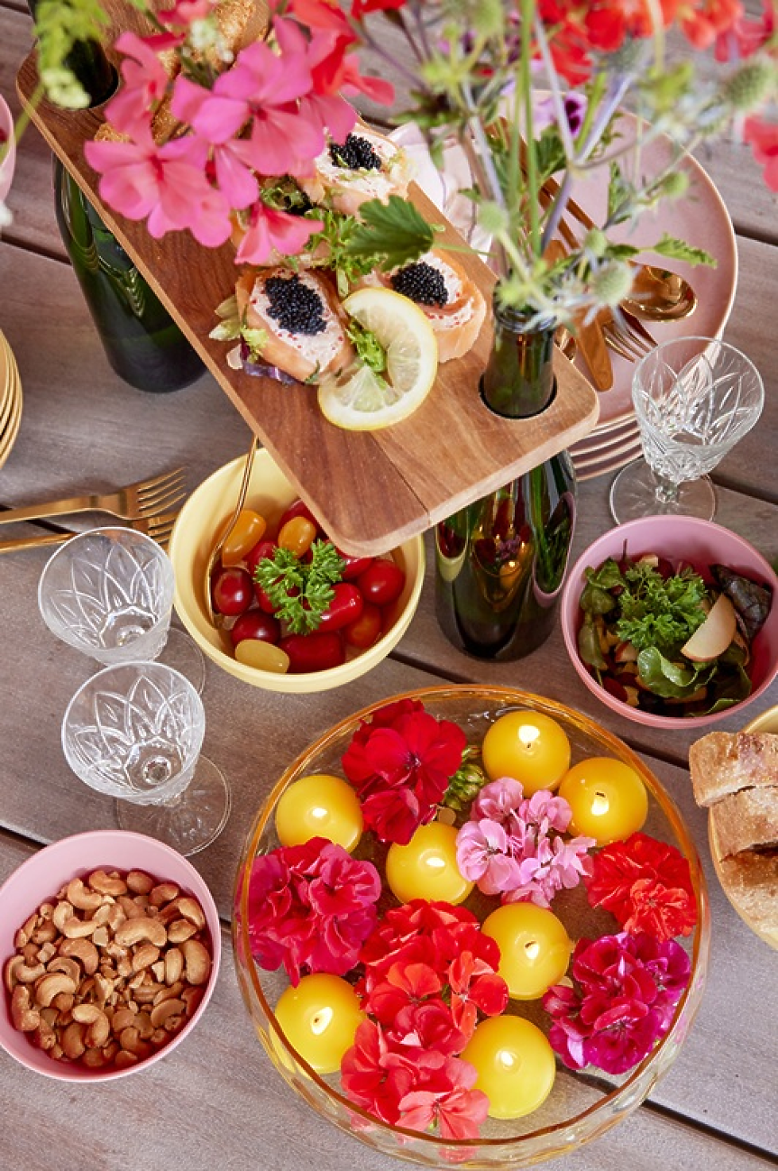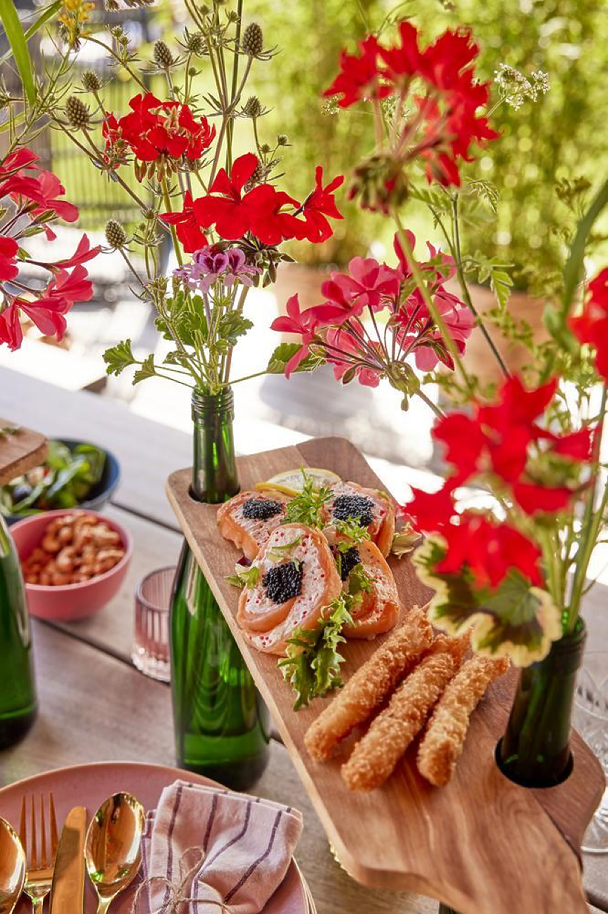 Вместо в чинии, тази домашно приготвена цветна маса включва парти предястия, поднесени на "въздушни" плата. Дъските се закрепват чрез празни бутилки от вино. Просто направете две или три дупки в дъските, съобразно размера на гърлата, и ги нанижете върху почистените бутилки. За да завършите тази лятна аранжировка на масата, добавете в напълнените с вода бутилки цпъстри отрязани цветове мушкато, морска светулка (Eryngium planum) и декоративни треви!