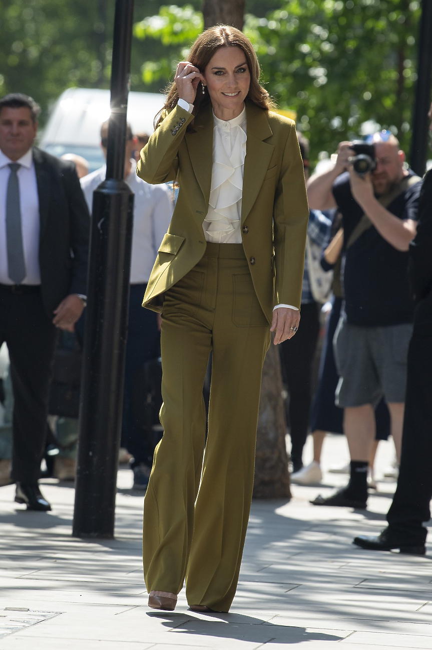 Излъчвайки изтънченост, Кейт впечатли с костюм в мъхесто зелено, дизайн на самата Виктория Бекъм. Той включваше панталон с разкроени крачоли, вдъхновени от 70-те години, с големи джобове и едноредно сако в същия зелен нюанс. За да завърши визията си, Кейт комбинира своя ансамбъл с бяла риза с яка с къдрици, тъмнокафяви обувки на ток и елегантни обеци с перли.
