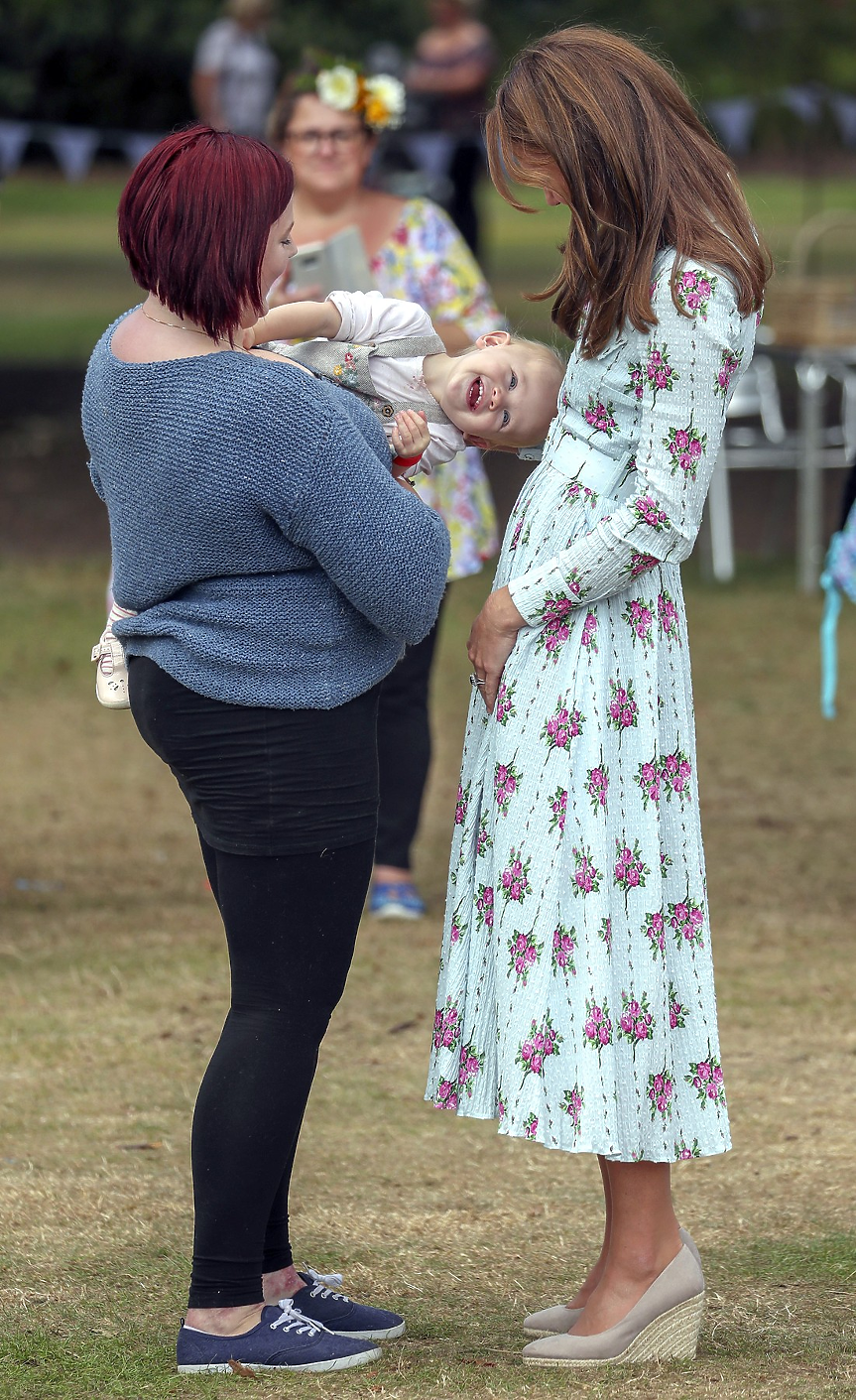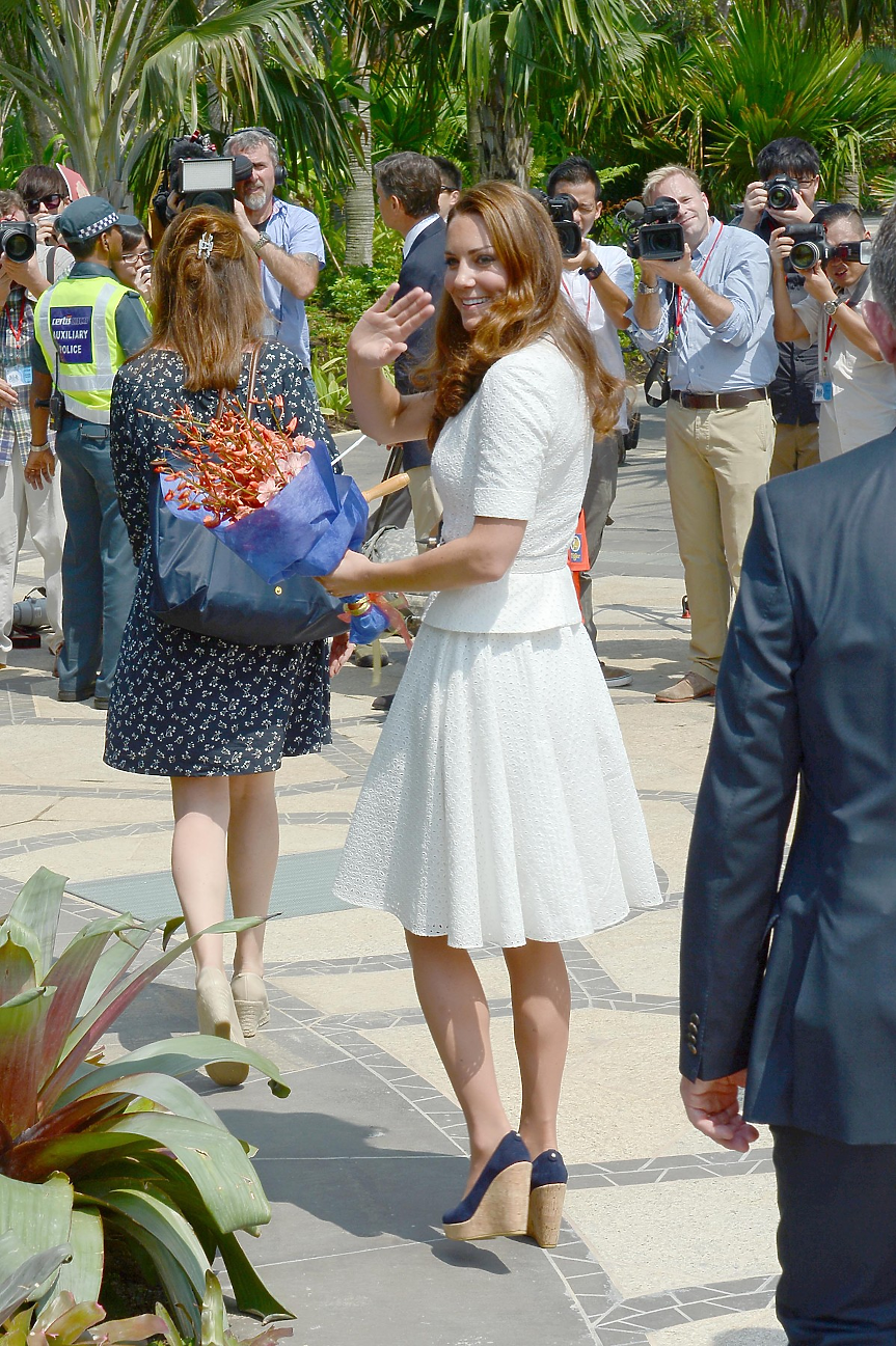 В съчетание с бяла рокля с пеплум и английска бродерия, принцеса Кейт носеи чифт сини еспадрили на висок корков ток. Макар и да привличаха вниманието, обувките не бяха толкова дръзки, че да не се комбинират с тъмносинята ѝ клъч чанта - но все пак са модел, който покойната кралица е известна с това, че не одобряваше.