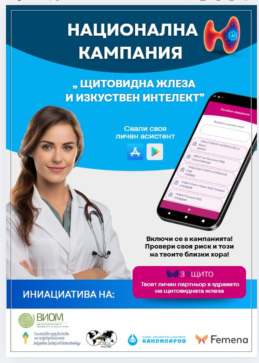 Сдружението на засегнатите от заболявания на щитовидната жлеза ВИОМ, в партньорство с медико-диагностични лаборатории „Кандиларов“, дигиталната платформа „Femena.bg” и Сдружение „Жените в бизнеса и професиите София“, стартира информационна и скринингова кампания „ЗаЩито“ – твоят личен партньор в здравето на щитовидната жлеза, за отбелязване на Световния ден на щитовидната жлеза (25 май) и Международната тиреоидна седмица (25-31 май). Планираните инициативи в българската кампания са в унисон с мотото на международната тиреоидна седмица „Щитовидна жлеза и изкуствен интелект“, като основният акцент се поставя върху ролята, която има изкуственият интелект (ИИ) за подобряване на диагностиката и лечението на заболяванията на щитовидната жлеза.