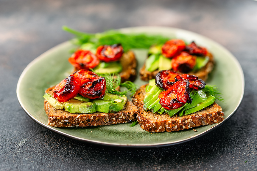 3. Препечете хляба до желаната степен на готовност и намажете всяко резенче със сместа от авокадо. Отгоре сложете домат и поръсете с тиквени семки и още сол и черен пипер на вкус.