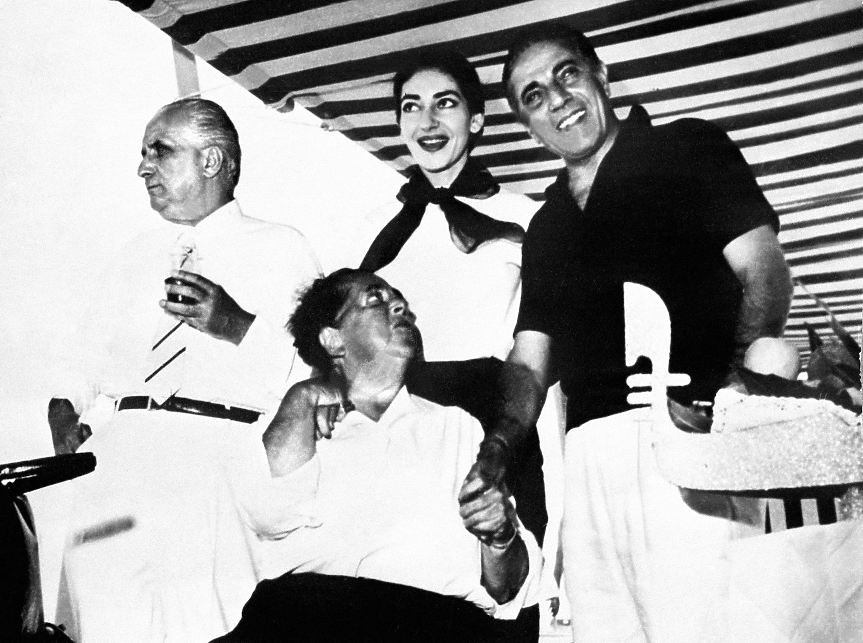 Калас се запознава с Онасис за първи път през 1957 г. на парти, организирано от светската личност Елза Максуел. Две години по-късно, според статия в The New York Times от 2000 г., Онасис кани оперната певица и съпруга ѝ да се присъединят към него и няколко други гости на круиз по Средиземно море на борда на неговата яхта.