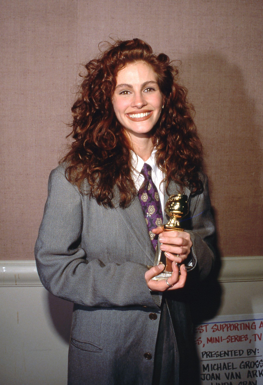 Джулия блестеше в квадратен черен костюм, бяла риза и бяла вратовръзка на райета. Разбира се, този стил е нейната отличителна черта. Спомняйки си най-известния си костюм за британския Vogue – мъжки костюм Armani, който си купи от бутика на Rodeo Drive, за да присъства на наградите „Златен глобус“ – Джулия каза, че не е имала представа, че тази визия ще се превърне в нейна визитна картичка. „Просто си мислех, че изглеждам страхотно, и все още пазя този костюм.“
