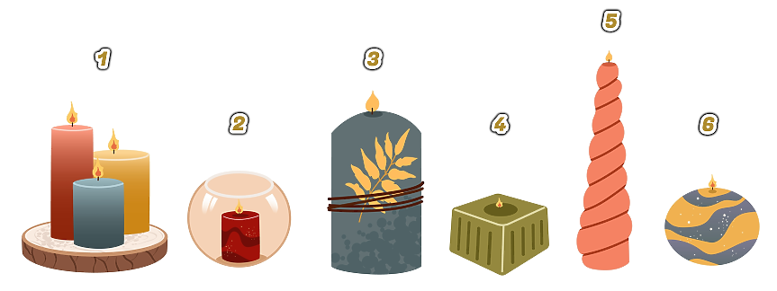 Погледни шестте свещи пред теб. Не мисли логично, не избирай „любимия“ си цвят — просто виж коя свещ те зове отвътре. Тази, която най-много привлече погледа ти, носи послание за твоята есен.