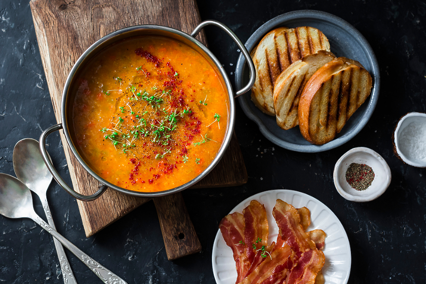 Задуши лука, чесъна, морковите и чушката в малко мазнина. Добави подправките и разбъркай, за да се разгърнат ароматите. Сложи лещата, залей с бульона и вари около 25–30 минути, докато омекне. По желание пасирай частично за по-гъста консистенция.