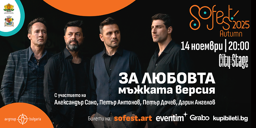 Четвъртък вечерта, Александър Сано, Дарин Ангелов, Петър Дочев и Петър Антонов ще ни въвлекат в един изумително смешен и покъртително откровен разговор на теми, които не посмяваме да изричаме, но страшно много ни вълнува. В театралната постановка „За Любовта...мъжката версия", с вълнуваща мултимедия, заедно с брилянтните актьори, на сцената ще е и талантливият музикант Милен Кукошаров. Спектакълът по текстове на Яна Борисова и под режисурата на Димитър Коцев - Шошо предизвика нечуван интерес и се разпродаде за броени дни.